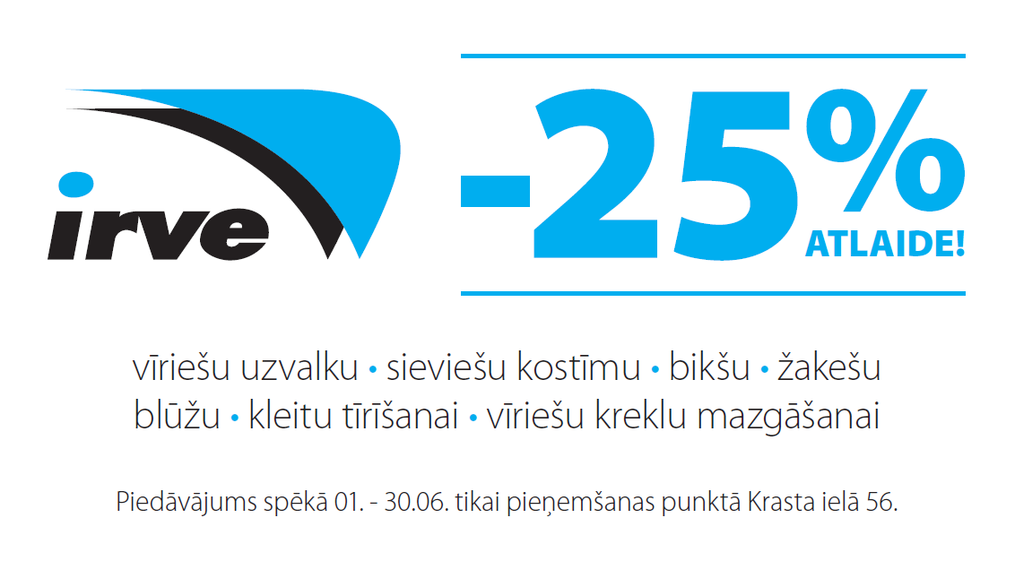 Izdrukā kuponu un saņem -25% atlaidi vīriešu uzvalku,sieviešu kostīmu, bikšu, žakešu, blūžu, kleitu tīrīšanai un kreklu mazgāšanai!